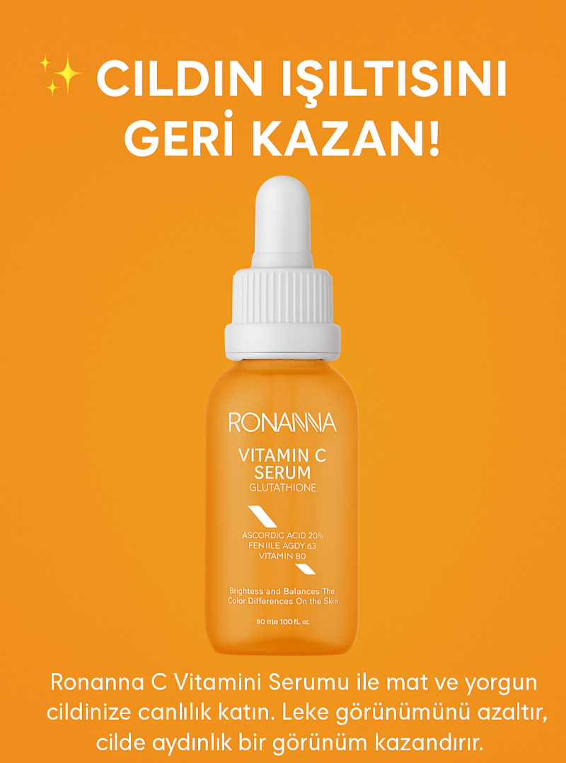 C vitamini serumu, cildin sağlıklı, canlı ve genç görünmesi için bir güç merkezidir. Askorbik Asit, cilt tonunu eşitleyerek koyu lekelerin görünümünü azaltır ve kolajen üretimini destekler. Bu sayede cilt daha sıkı ve dolgun bir görünüm kazanır. Ferulik Asit ve Glutatyon, cildi çevresel faktörlerin neden olduğu serbest radikallerin zararlı etkilerinden korur. Antioksidan etkileri, ciltte erken yaşlanma belirtilerini azaltır ve dokuların kendini onarmasına yardımcı olur. B5 vitamini, cildin nem dengesini sağlar, esnekliğini artırır ve cildi yumuşatarak pürüzsüz bir görünüm kazandırır. Düzenli kullanım, cildinizin canlılığını ve doğal ışıltısını güçlendirir, yüzünüz daha genç, sağlıklı ve dinamik bir görünüme kavuşur. ???? Ronanna C Vitamini Serumu, tamamen doğal içeriği ile cildinizi besler ve korur. Amacı, geçici bir parlaklık değil, cildin kendi doğal ışığını ortaya çıkarmak ve uzun vadeli sağlıklı bir görünüm kazandırmaktır. Her damla, cildinize derinlemesine bakım sağlar ve onu canlandırır.